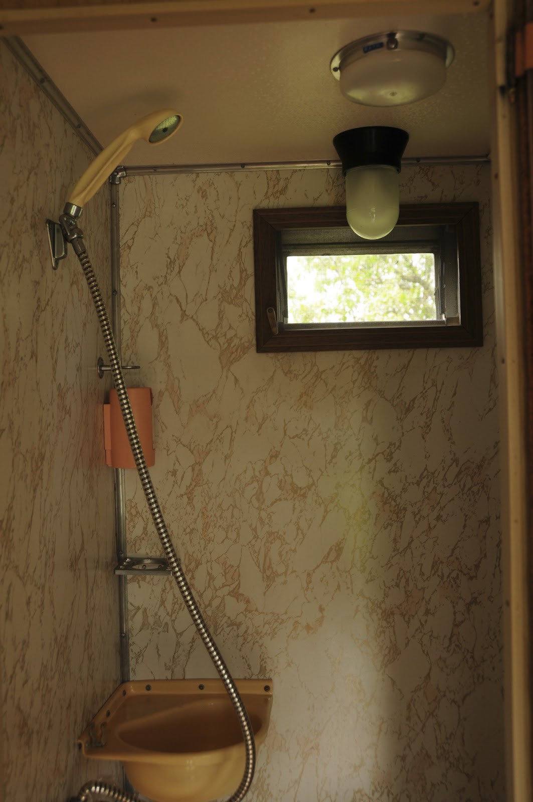 The shower room. The selling feature of the camper. Needs a new toilet. Not sure If I will keep the corner basin either. Don't see us brushing our teeth that close to where we use the potty.